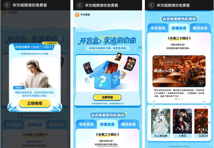 追剧福利必须适配学生党的钱包!近期华为视频“开盲盒享追剧解放”步履确切太香了,新用户专属buff叠满:对着小艺说“我要追剧解放”,就能参与抽奖,有契机领取立地会员!我就欧气爆棚抽到了优酷视频会员月卡,刚好追《长安二十四计》,径直省了一笔会员钱。